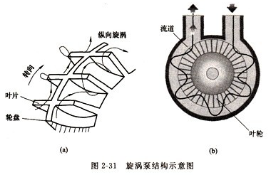 旋涡泵叶轮具有开式和闭式两种,闭式叶轮叶片凹槽内设有中间隔板,如图2-31(a)所示:开式叶轮无中间隔板。